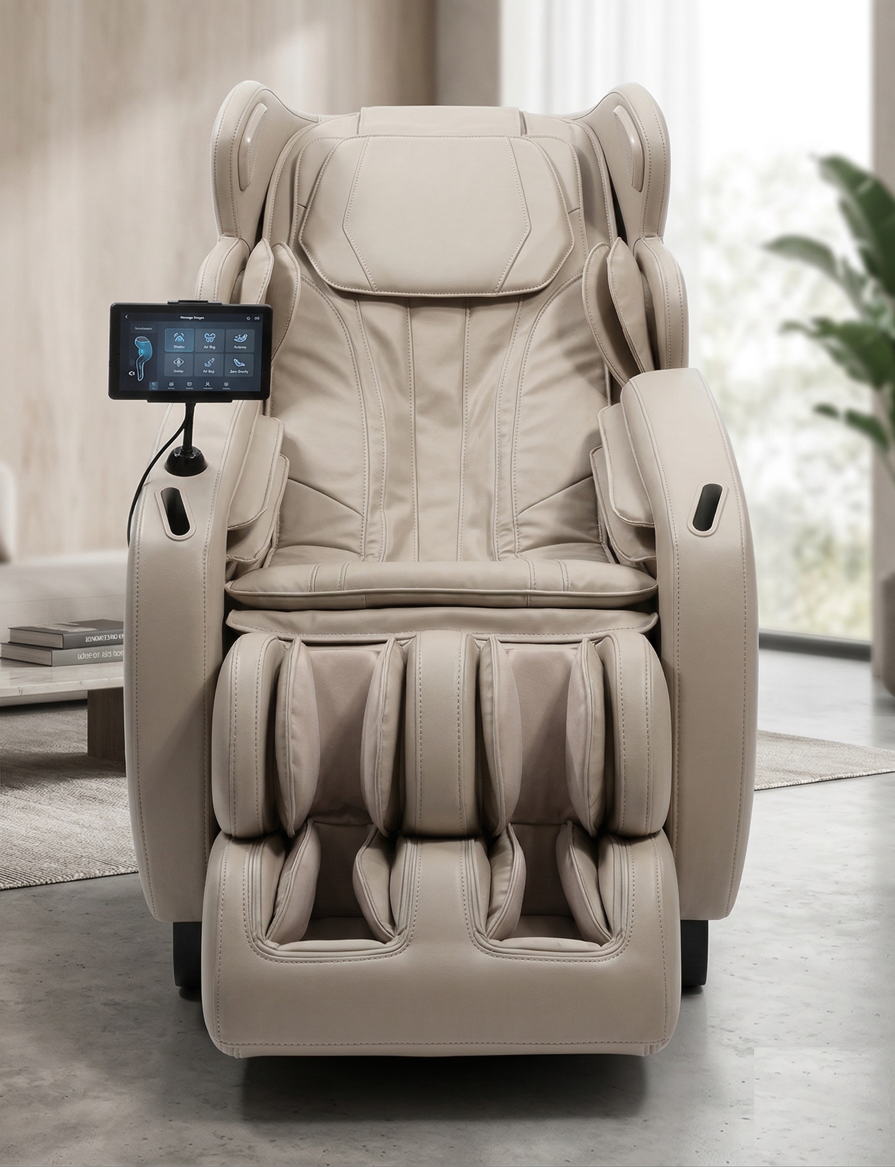 Fotel masujący sterowany dużym tabletem oferuje intuicyjne i nowoczesne sterowanie wszystkimi funkcjami za pomocą dużego, dotykowego ekranu, co ułatwia personalizację masażu.